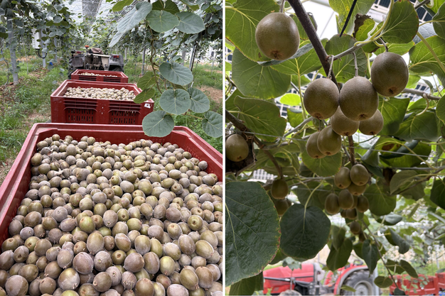 Récemment lancé dans la culture du kiwi, Anthony Oboussier a d'abord récolté ses premiers kiwis jaunes à la mi-septembre. « Ce fut une petite récolte, mais rien d'anormal pour une première année », explique-t-il. Quelques semaines plus tard, le 10 octobre, c'est la récolte de kiwis rouges qui a démarré. « Nous avons obtenu 1,4 tonne par hectare. C'est un début encourageant, car la qualité gustative est vraiment au rendez-vous, avec un taux de sucre élevé et une belle coloration interne ».