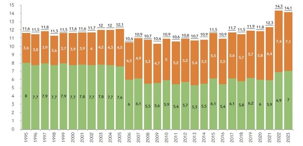 Mais surtout, selon les données d'Eurostat traitées par diaNEOsis dans son étude 2024, The Agricultural Sector in Greece, la valeur de la production agricole n'a pas non plus atteint les niveaux d'avant 2008. Malgré la tendance positive observée au cours de la période 2010-2020, la production agricole grecque n'a pas été en mesure de connaître une véritable expansion. Au contraire, la production agricole totale a montré une tendance négative au cours des 30 dernières années, avec une baisse annuelle moyenne d'environ 0,3 %. L'année 2023 est exclue du calcul en raison de l'impact dramatique de la tempête Daniel sur l'agriculture grecque ; sinon, la baisse annuelle moyenne dépasse 0,9 %.