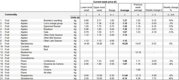 Parmi les baies, les mûres ont atteint en moyenne £15,20 le kilogramme, soit une augmentation de 4% par rapport aux £14,67 de la semaine précédente. Les framboises, cependant, ont baissé de 6% à £11,46 le kilogramme, tandis que les fraises ont enregistré une hausse de 40% à £6,14 le kilogramme. Les prix des myrtilles ont été signalés à £12,18 le kilogramme, bien qu'inchangés par rapport à la semaine dernière en raison d'un nombre limité de mises à jour.