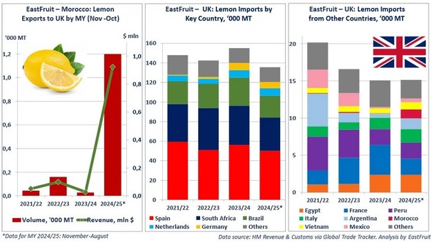 Les analystes d'EastFruit font état d'une forte augmentation des exportations de citrons marocains vers le Royaume-Uni entre novembre 2024 et août 2025. Au cours de cette période, le Maroc a expédié 1 200 tonnes de citrons vers le Royaume-Uni, pour une valeur de 920 000 dollars US. Le volume exporté était 40 fois supérieur à celui de la campagne précédente et dépassait les exportations totales de citrons du pays vers le Royaume-Uni au cours de la dernière décennie.