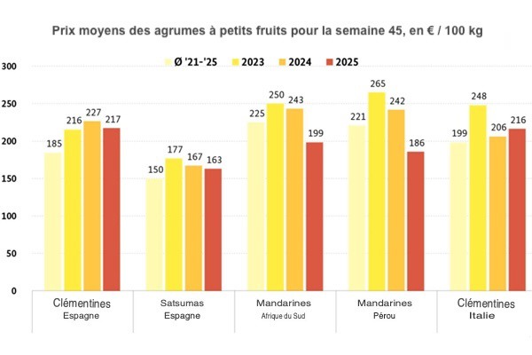 Dans l'ensemble, la demande s'est raffermie : les conditions automnales et la baisse des températures ont redynamisé le commerce, selon la BLE. Les prix, en revanche, sont restés irréguliers : les clémentines espagnoles, abondantes en cette période de pleine saison, ont souvent affiché des tarifs plus bas. À l'inverse, les mandarines sud-africaines, dont la disponibilité s'est réduite, ont enregistré une légère hausse des prix après une période de faibles cotations.
