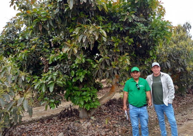 Guido García Mendoza (directeur d'exploitation) et Claudio Villegas (propriétaire de l'exploitation) devant un arbre de la variété Zutano. « Dans cette parcelle de 8 hectares d'avocats Hass, il y a environ 105 arbres Zutano, qui servent de pollinisateurs », explique Claudio Villegas, qui, après trois ans de collaboration avec le Grupo Juan Ruiz, souligne qu'il se sent accompagné et soutenu tout au long du processus de culture et de commercialisation. « De plus, je ne subis pas de pertes dues aux fruits jetés, car le groupe achète la totalité de la production. »