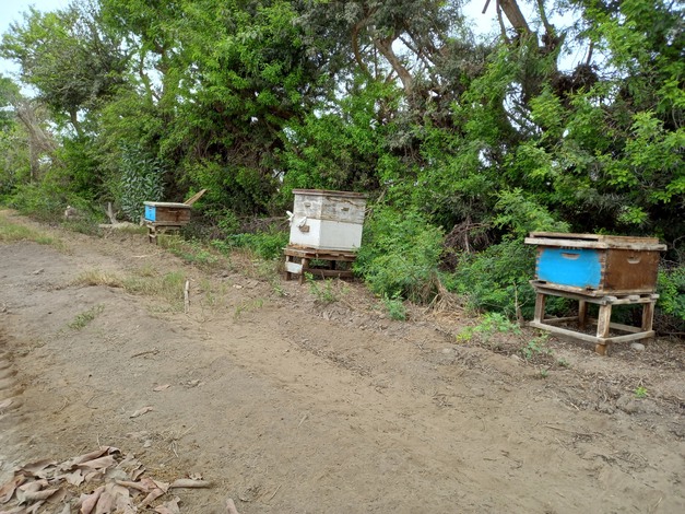 Des ruches placées le long d'une rangée d'arbres, qui protègent la parcelle des problèmes fongiques causés par les vents froids et humides provenant de l'océan Pacifique, à cinq kilomètres de là.