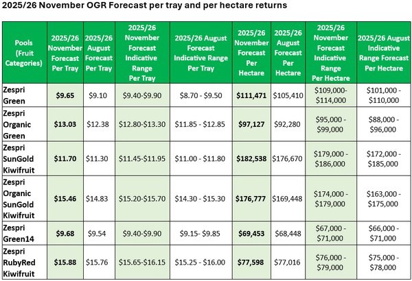 Zespri a publié ses prévisions de novembre pour la saison des kiwis 2025/26, faisant état d'estimations de rendement par plateau plus élevées pour tous les groupes de fruits par rapport à ses prévisions d'août. La société a déclaré que les rendements pour les kiwis Green, Organic Green et Organic SunGold dépassent maintenant la limite supérieure de la fourchette de prévision précédente. Au niveau de l'hectare, des rendements records sont actuellement prévus pour toutes les catégories.