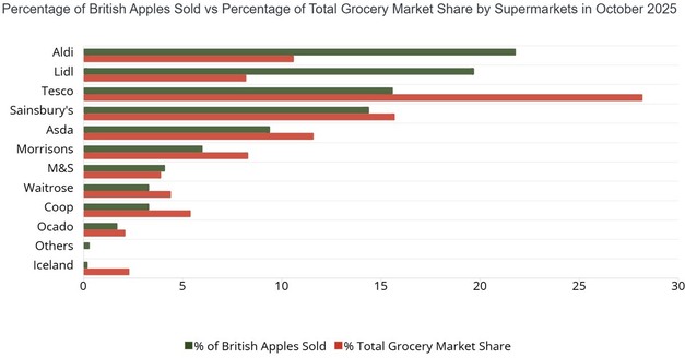 Les producteurs notent que la comparaison entre la part d'approvisionnement et la part de marché globale fournit une image de plus en plus importante du soutien des détaillants aux produits britanniques. Si certains supermarchés répondent parfaitement aux attentes, d'autres affichent un écart important entre leur empreinte sur le marché et leur contribution aux ventes nationales de pommes.