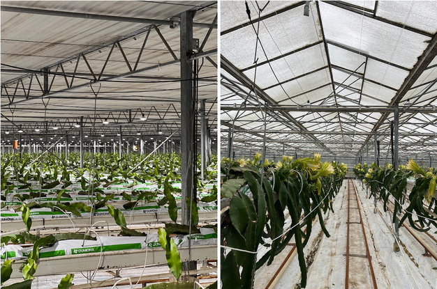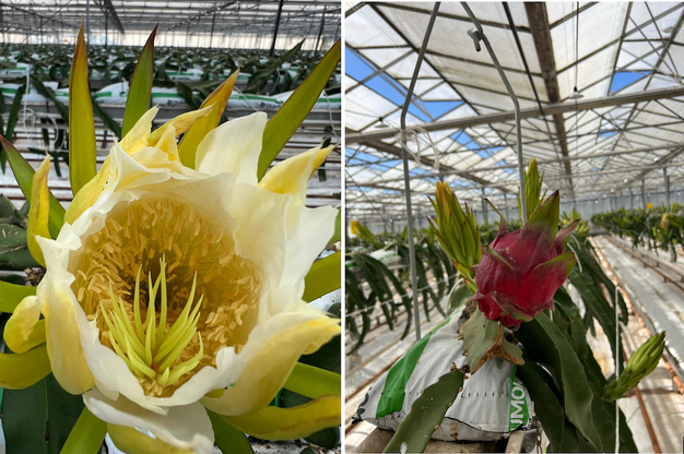 Traditionnellement cultivé en pleine terre, le pitaya nécessite une adaptation complète pour être conduit en hors-sol. « Le pitaya est issu d'un cactus, qui peut vivre une vingtaine d'années. Avec la société Dumona, nous avons voulu développer un substrat spécifique, capable de durer au moins dix ans tout en assurant un drainage optimal ». Autre spécificité de la culture, la plante met traditionnellement 12 à 18 mois avant de « retomber », ce qui marque le début de la floraison et donc de la fructification. Mais pour réduire ce temps afin d'entrer plus vite en production, Abderrahim Oufaquir a choisi de faire une plantation sur gouttières déjà à deux mètres de hauteur : « Les plantations faites en mars 2025 ont donné leurs premières fleurs dès la fin de l'été, ce qui nous a donc permis de gagner un temps précieux ». Et pour favoriser un épanouissement optimal de cette plante à jours longs, le producteur a choisi un éclairage nocturne et léger.