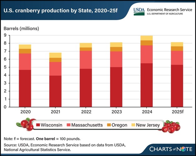 Pour 2025, la récolte américaine de canneberges devrait s'élever à 8,13 millions de barils (369 000 tonnes environ), soit une baisse de 9 % par rapport à 2024, mais proche de la moyenne quinquennale de 7,95 millions de barils. Le Wisconsin reste le plus grand État producteur, représentant généralement environ 60 % de la production nationale. La récolte de 2025 devrait s'élever à 5,3 millions de barils, soit 3 % de moins qu'en 2024, mais 4 % de plus que la moyenne des trois années précédentes.