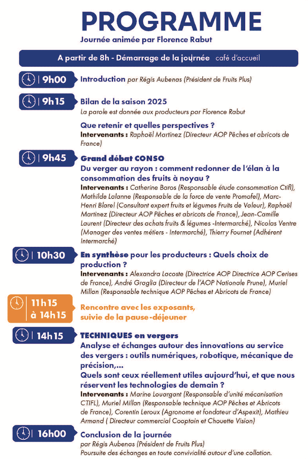 De 9h à 12h, trois temps forts rythmeront la matinée. La journée débutera par un bilan de la saison 2025 présenté par Raphaël Martinez (Directeur AOP Pêches et Abricots de France). La parole sera alors donnée aux producteurs. Puis la production, la recherche et la grande distribution – représentée par Intermarché –, interviendront pour le Grand Débat Conso qui s'articulera autour du thème : « Du verger au rayon : comment redonner de l'élan à la consommation des fruits à noyau ? ». Les échanges et débats se termineront par une intervention dédiée aux producteurs, concernant les choix de productions pour l'avenir.