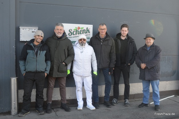 L'équipe de la société Ludwig Schenk, avec son dirigeant senior M. di Gregorio (tout à droite). L'entreprise, installée de longue date, exploite en plus du commerce de gros une unité de découpe également implantée sur le marché de gros