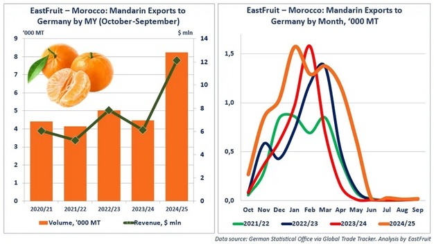 D'octobre 2024 à septembre 2025, les exportateurs marocains ont expédié 8 200 tonnes de mandarines et de clémentines vers l'Allemagne, pour une valeur de 12,1 millions de dollars US. Cela représente une augmentation de 60 % par rapport au précédent record de 2022/23 et marque la première fois que les recettes d'exportation dépassent les 10 millions de dollars US. L'Allemagne n'est pas traditionnellement un débouché principal pour les mandarines marocaines, mais en 2024/25, sa part a augmenté pour atteindre 1,45 pour cent des exportations totales du Maroc, plaçant l'Allemagne au onzième rang des importateurs.