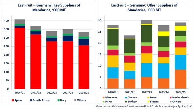 L'Espagne est restée le principal fournisseur de l'Allemagne avec plus de 76 % des importations totales, bien que les volumes espagnols aient diminué. L'Afrique du Sud a représenté 11 pour cent et l'Italie 4 pour cent, les 9 pour cent restants provenant d'autres origines. À mesure que les expéditions espagnoles diminuent, d'autres fournisseurs renforcent leur présence sur le marché.
