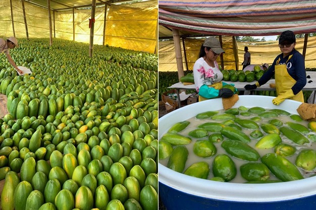 © Green Control À gauche : Alex Bustos (à gauche) dans un champ de papayes Solo Sunrise. À droite : papayes Passion Red.