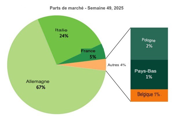 Les arrivages en provenance de France se sont renforcés au cours de la semaine, principalement avec Pink Lady et Jazz proposées en plateaux. Les apports néerlandais et belges n'ont pas dépassé un rôle complémentaire. La demande s'est montrée plutôt dynamique, mais a pu être satisfaite aisément grâce à une disponibilité accrue. Comme souvent durant l'Avent, les fruits à joues rouges ont été particulièrement mis en avant. Les prix sont globalement restés au niveau de la semaine précédente.