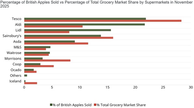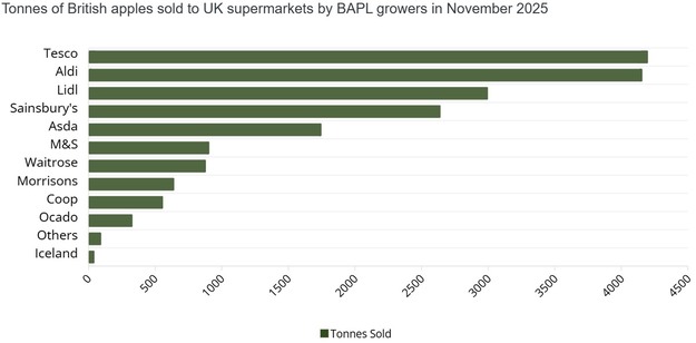 Les ventes de pommes britanniques dans les supermarchés britanniques en novembre 2025 montrent une nette concentration entre un petit nombre de grands détaillants, Tesco et Aldi étant en tête du marché en termes de volume. Ces deux chaînes ont absorbé les plus gros tonnages de pommes britanniques vendues par les producteurs de la BAPL au cours du mois, ce qui renforce leur rôle de premier débouché pour les pommes britanniques. Lidl et Sainsbury's suivent à une certaine distance, tandis qu'Asda constitue le deuxième niveau d'acheteurs en volume. Les autres détaillants ont pris des quantités nettement inférieures, ce qui montre à quel point la production de pommes britanniques reste tributaire d'une poignée de grands programmes de supermarchés.
