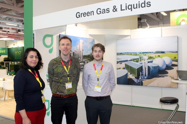 © Thijmen Tiersma | FreshPlaza.frGreen Gas & Liquids à Fruit Logistica 2025, avec la directrice générale Laleh Hosseini à gauche, à côté d'Arie van der Meulen et Theau Bunel.