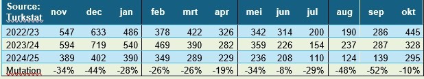 Le gel printanier en Turquie a eu un impact majeur sur les volumes d'exportation de légumes et surtout de fruits frais. Cette année, ces exportations devraient être inférieures de près de 30 % à celles de 2024. Même l'année dernière, les volumes d'exportation étaient nettement inférieurs à ceux des années précédentes.