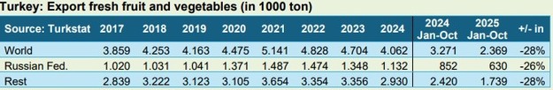 À partir d'avril 2024, les exportations turques de fruits et légumes frais ont nettement diminué. Cette tendance à la baisse s'est poursuivie en 2025.