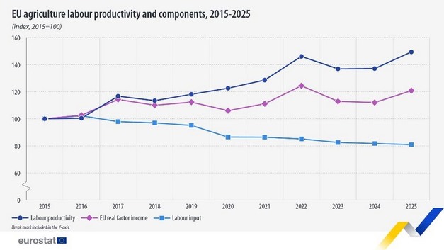 Si l'on considère les tendances à plus long terme, la productivité de la main-d'œuvre agricole de l'UE en 2025 était supérieure de 49,4 % à celle de 2015. Au cours de cette décennie, l'indice du revenu réel des facteurs a augmenté de 20,8 %, tandis que l'indice de la main-d'œuvre agricole a diminué de 19,1 %, reflétant les changements structurels en cours dans le secteur.