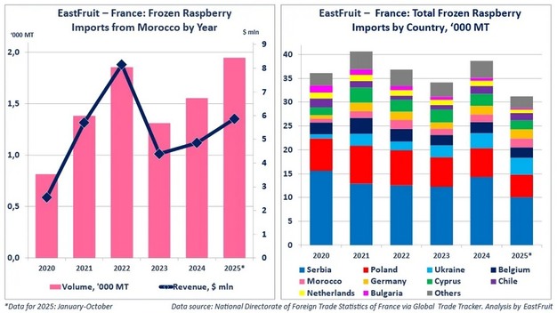 Le Maroc a atteint un nouveau volume d'exportation de framboises surgelées vers la France en 2025, selon les données d'EastFruit. Au cours des 10 premiers mois de l'année, la France a importé du Maroc 1,95 mille tonnes de framboises et de mûres surgelées sous le code HS 081120, pour une valeur totale de 5,8 millions de dollars US. Ce volume est supérieur de 25 % à celui de la même période de l'année précédente et de 5 % au précédent record établi en 2022.