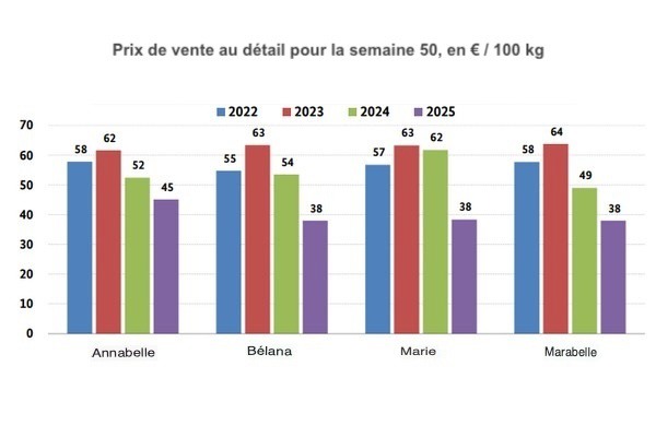 Sur le marché de la pomme de terre, les actions promotionnelles de Noël ont stimulé la demande. Les ventes en magasins à la ferme se sont également améliorées, souvent en combinaison avec la commercialisation de sapins de Noël ou d'autres produits saisonniers. Les prix à la production pour les marchandises de qualité issues du stockage ont pu se consolider. La pression de l'offre provenant des stocks intermédiaires a nettement diminué, même si l'offre globale reste abondante.