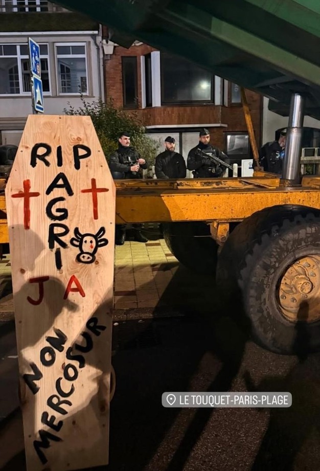 Sur le sol français, la contestation se poursuit également. Ce vendredi, une trentaine d'agriculteurs, accompagnés d'une vingtaine de tracteurs et de plusieurs remorques, se sont rassemblés au Touquet (Pas-de-Calais), devant la villa du président Emmanuel Macron, à l'appel de la FDSEA. Une action qualifiée de « symbolique » par les organisateurs, marquée par l'installation d'un cercueil sur lequel figuraient les slogans « RIP Agri », « Non Mercosur » ou encore « Mange français ». Les manifestants dénoncent un « ras-le-bol généralisé ». Selon le ministère de l'Intérieur, 110 actions agricoles ont encore été recensées jeudi en France, rassemblant plus de 5 000 agriculteurs, signe d'une mobilisation qui reste vive à l'approche des fêtes de fin d'année.