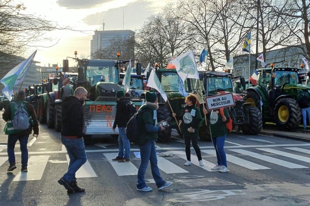 Plus de 7 000 agriculteurs ont manifesté jeudi dans les rues de la capitale belge, à l'appel du syndicat européen Copa-Cogeca, pour dénoncer la ratification de l'accord UE-Mercosur, mais aussi la taxe carbone sur les engrais et l'avenir de la Politique agricole commune (PAC). Selon la police bruxelloise, 7 300 personnes ont pris part à la mobilisation, accompagnées de près de 950 tracteurs, paralysant plusieurs axes du quartier européen. Des agriculteurs venus de 25 pays, dont 4 000 de Français d'après la FNSEA qui annonce, elle un total de 10 000 manifestants, alors que s'ouvrait un sommet des chefs d'État et de gouvernement.