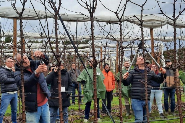 Le temps fort de la matinée a été consacré à une démonstration pratique de la taille et du renouvellement des branches par les experts de Salvi. Car la gestion correcte des branches d'un an dans le système d'espalier n'est pas seulement une question d'esthétique, mais un facteur déterminant pour garantir un ensoleillement correct, une facilité de récolte et, par conséquent, des coûts de gestion réduits.