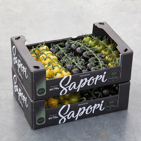 Sapori | Finest Selection de Wim Peters Kwekerijen (Hall 1.2, Stand C-51) aux Pays-Bas se distingue par ses saveurs uniques et ses couleurs extraordinaires. Il s'agit d'une sélection particulièrement raffinée de mini-tomates cerises, qui se distinguent à la fois par leur saveur et leur couleur. La sélection de 1,5 kilogramme comprend des fruits ivoire, noirs et verts.