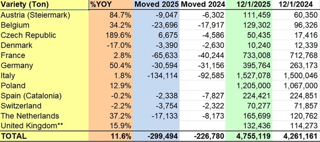 Le total des stocks européens de pommes s'élevait à 4 755 119 tonnes au 1/12/2025, contre 4 261 161 tonnes un an plus tôt, soit une augmentation de 11,6 % d'une année sur l'autre. Les mouvements de pommes depuis le début de la saison ont atteint -299 494 tonnes en 2025, contre -226 780 tonnes en 2024.