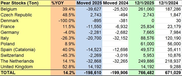 Les stocks totaux de poires européennes ont atteint 766 482 tonnes au 1/12/2025, contre 671 029 tonnes un an plus tôt, ce qui représente une augmentation de 14,2 % d'une année sur l'autre. Les mouvements de poires se sont établis à -198 610 tonnes en 2025, ce qui correspond largement à -199 906 tonnes en 2024.