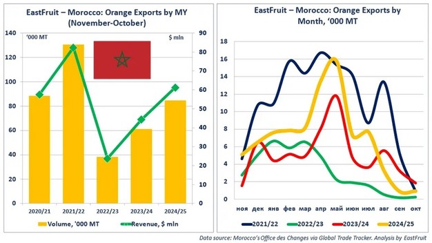 Au cours de la saison 2024/25, de novembre à octobre, le Maroc a exporté 84,6 milliers de tonnes d'oranges pour une valeur de 61 millions de dollars US. Les volumes d'exportation ont augmenté de 38 % par rapport à la saison précédente et ont plus que doublé par rapport au point bas atteint en 2022/23.