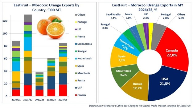Le Canada et les États-Unis sont restés les principales destinations des oranges marocaines, représentant respectivement 22,0 pour cent et 21,5 pour cent des expéditions totales. Les exportations vers le Canada ont augmenté de 65 % par rapport à la saison précédente, tandis que les volumes vers les États-Unis ont diminué, ce qui en fait le seul pays parmi les dix premières destinations du Maroc à enregistrer une réduction. La Russie s'est classée troisième et a continué d'augmenter ses importations de produits marocains malgré les sanctions européennes.