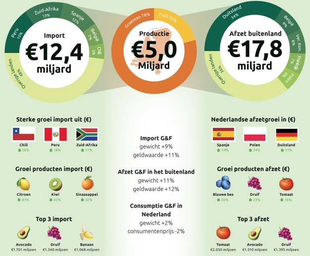 La production, les importations et les exportations ont toutes connu une nette croissance. Les consommateurs néerlandais ont également acheté un peu plus de fruits et légumes. Cela souligne l'importance économique et sociale croissante du secteur.