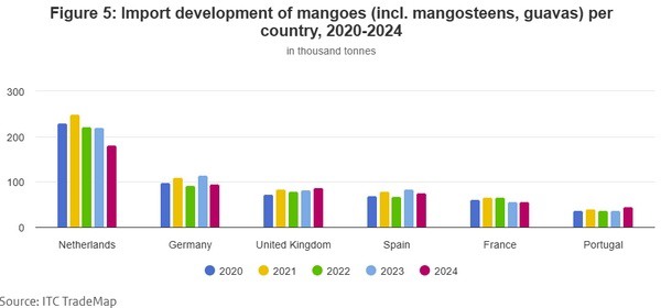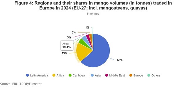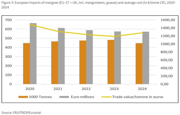 L'Europe est le deuxième importateur mondial de mangues fraîches. La demande est stable et continue de croître, soutenue par les promotions des détaillants et l'évolution vers des expériences alimentaires de plus grande qualité. Le Brésil approvisionne le marché européen tout au long de l'année, avec les variétés Palmer, Keitt, Tommy Atkins et Kent comme principales variétés d'exportation. Osteen ne représente qu'une petite partie des exportations brésiliennes. Le Pérou exporte exclusivement des mangues Kent et est réputé pour sa qualité constante, bien que la production ait diminué au cours des dernières saisons en raison d'El Niño.