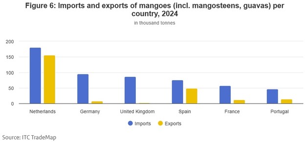 Les mangues sont importées en Europe dans des volumes de plus en plus importants, grâce à un approvisionnement tout au long de l'année à partir d'origines multiples et à une demande croissante pour des fruits de qualité gustative constante. Les consommateurs européens affichent une nette préférence pour les variétés à faible teneur en fibres, en particulier Kent et Keitt, et la demande augmente pour les mangues vendues mûres sur l'arbre, prêtes à consommer ou fraîchement coupées. Les principaux marchés européens d'importation de mangues fraîches sont les Pays-Bas, l'Espagne, l'Allemagne, la France et la Belgique.
