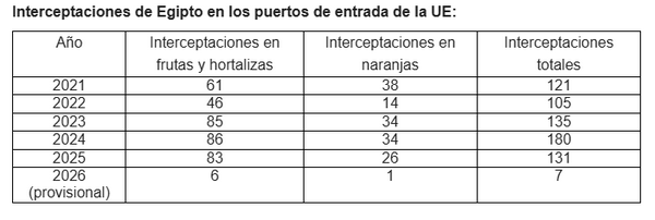 AVA-ASAJA prévient qu'il ne s'agit pas d'un cas isolé, car les fruits et légumes en provenance d'Égypte ont déjà accumulé sept non-conformités notifiées par le RASFF jusqu'à présent en 2026. En 2025, l'Égypte a enregistré 131 interceptions - 83 pour les fruits et légumes et 26 pour les agrumes - et en 2024, elle a atteint un record historique de 180 interceptions - 86 pour les fruits et légumes et 34 pour les agrumes. Au cours des cinq dernières années, l'Égypte a enregistré un total de 672 détections.