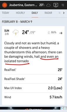 Les habitants de Langkloof disent qu'ils n'ont jamais connu de tornade dans la vallée de mémoire d'homme ; depuis cet incident, les prévisions météorologiques ont répété les alertes à la tornade.