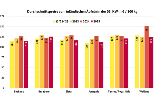 À Berlin et Hambourg, les possibilités de stockage ont en revanche été limitées en raison des conditions hivernales : dans la ville hanséatique, des volumes importants ont été écoulés via le commerce de gros. À Francfort, les variétés locales Wurtwining, Deichperle et Fräulein ont été particulièrement appréciées et se sont vendues rapidement. D'une manière générale, les commerçants ont rarement eu besoin d'adapter leurs commandes préalables. Seules les Pinova et Tenroy du lac de Constance ont enregistré une baisse de prix à Munich, tandis que les acheteurs ont eu à payer davantage pour les Braeburn allemandes.