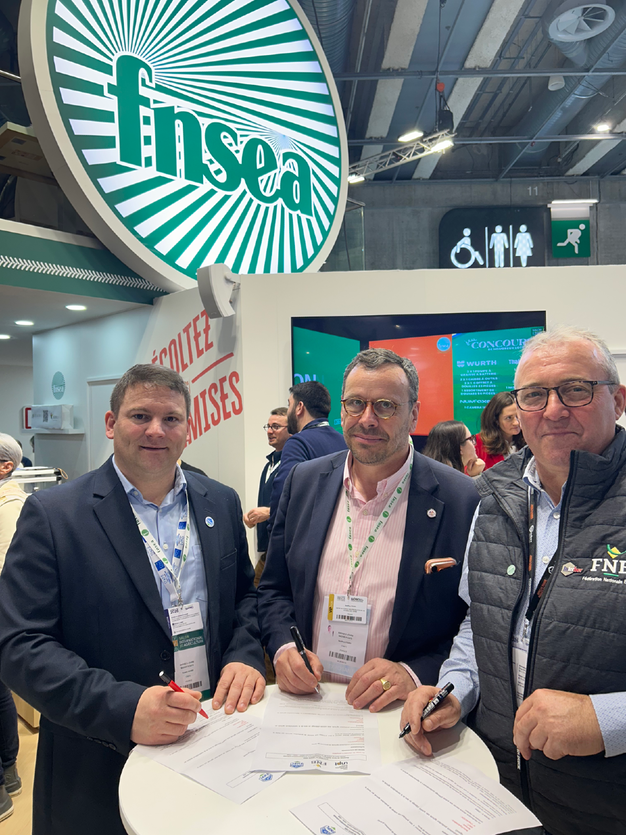 A droite : Yohann Barbe - Président de la Fédération Nationale des Producteurs de Lait (FNPL), Geoffroy d'Evry – Président de l'UNPT & Patrick Bénézit – Président de la Fédération Nationale Bovine (FNB) ont signé le 23 février au Salon de l'Agriculture sur le stand de la FNSEA, la convention cadre du lancement de cette plateforme