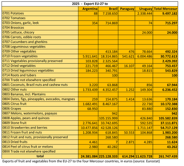 Sur la base des totaux de la classification douanière des chapitres 07 et 08, l'UE-27 exportera pour 261,7 millions d'€ de fruits et légumes vers les quatre pays du Mercosur réunis en 2025. Dans le sens inverse, l'UE importe 1,34 milliard d'€ du Mercosur. Au total, l'UE enregistre un résultat commercial négatif de 1,078 milliard d'€. Le déficit concerne principalement les fruits, les fruits à coque et les fruits secs (chapitre 08), avec 216,5 millions d'€ d'exportations contre 1,145 milliard d'€ d'importations de l'UE. Pour les légumes (chapitre 07), l'écart est moins important, mais reste substantiel : 45,2 millions d'€ d'exportations contre 195 millions d'€ d'importations.