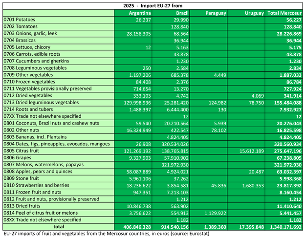 Les relations commerciales entre l'Union européenne et le bloc sud-américain Mercosur sont souvent évoquées en termes de voitures, de soja ou de bœuf. L'échange de fruits et légumes est moins visible, mais tout aussi important. Selon les chiffres préliminaires des ventes de fruits et légumes en 2025 (source : Eurostat), le poids de l'UE reste clairement en retrait.