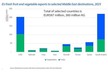 Les exportations européennes de fruits sont soutenues par un nombre relativement limité de lignes de produits hautement compétitives. Le poste d'exportation le plus important est celui des pommes, avec 77,6 millions d'€. Sur ce montant, 77,5 millions sont destinés au Brésil. Au sein de l'UE, l'Italie avec 45,5 millions d'€ et le Portugal avec 22,1 millions sont de loin les principaux fournisseurs, suivis par l'Espagne et la France. Les kiwis arrivent en deuxième position avec 50,3 millions d'€. Ce produit est principalement fourni par la Grèce pour 28,9 millions d'€ et l'Italie pour 17,9 millions, le Brésil étant la première destination et l'Argentine la deuxième. Viennent ensuite les prunes avec 30,7 millions d'€, les poires avec 27,9 millions et les pêches/nectarines avec 6,4 millions.