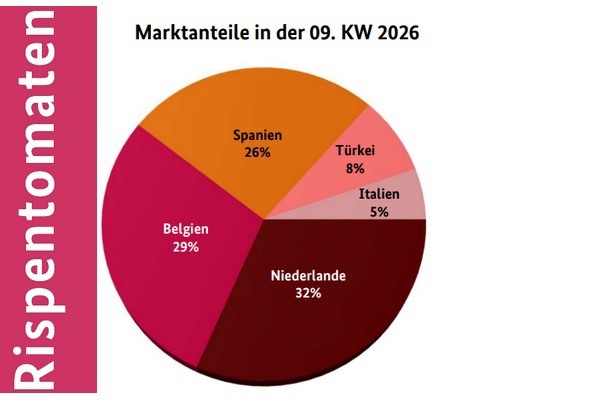 Un large assortiment de tomates était disponible, avec la participation de nombreux pays. Les arrivages espagnols ont dominé le marché, tandis que les volumes en provenance de Belgique et des Pays-Bas ont progressivement augmenté. Les lots originaires de Turquie et du Maroc n'ont pas toujours convaincu en termes de qualité, et certaines expéditions espagnoles ont parfois souffert d'un manque de fraîcheur. L'offre a été complétée par des apports d'Italie et d'Égypte. Selon le BLE, la météo printanière a certes stimulé la demande, mais les besoins ont pu être satisfaits sans difficulté majeure. Les cotations ont été majoritairement orientées à la baisse. Même les exigences tarifaires revues à la baisse par les négociants ne suffisaient toutefois pas toujours à assurer l'écoulement des volumes. À Munich, par exemple, des excédents se sont formés et n'ont pas pu être écoulés avant le week-end. En raison d'une qualité parfois hétérogène, des écarts de prix importants ont été observés sur certains marchés.