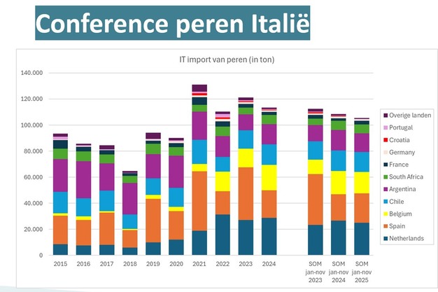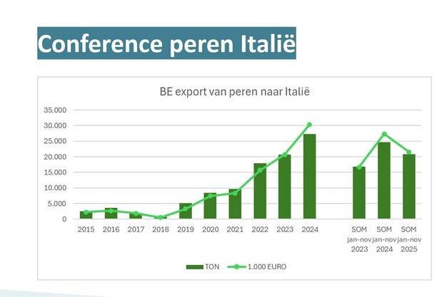 Les exportations belges de Conférence vers l'Italie sont donc en nette augmentation. Selon VLAM, la situation actuelle du marché offre une excellente opportunité d'accélérer encore cette croissance. En effet, sur la base de sources d'Eurostat, les données de VLAM montrent que les importations de poires ont clairement augmenté au cours des 10 dernières années, l'importance des pays de l'UE, tels que les Pays-Bas et la Belgique, augmentant de manière significative par rapport aux parties tierces. Les exportations de poires belges vers l'Italie s'élèvent aujourd'hui à près de 30 000 tonnes, contre 3 000 il y a dix ans. »