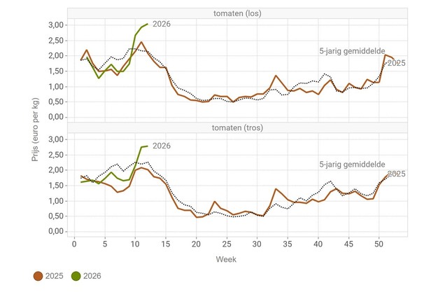 Les prix des tomates ont encore augmenté la semaine dernière lors des ventes de la Fédération des coopératives horticoles belges. Les volumes sont supérieurs et les prix beaucoup plus élevés que ceux de la semaine 12 en 2025 : ils affichaient plus de 3€/kg pour les tomates rondes et 2,79 €/kg pour les grappes.