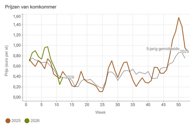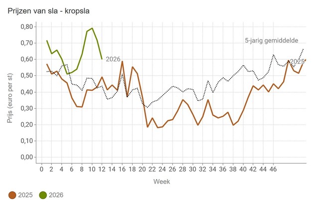 Les prix de la laitue pommée ont longtemps été élevés et ils le sont toujours, malgré une certaine diminution. Au cours de la semaine 12, leur prix moyen était de 60 centimes d'€ par tête.