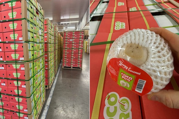 « En regardant dehors, on n'a pas encore l'impression d'être sous les tropiques, mais avant qu'on ne s'en rende compte, on sera assis au soleil dans le jardin. Presque chaque semaine, nous recevons des livraisons de noix de coco brunes et jeunes. Nous en vendons beaucoup à l'avance, y compris pour les fêtes pascales qui se profilent. Dès que le conteneur arrive, la plupart des palettes sont immédiatement expédiées. La réduction des coûts et la fraîcheur sont alors à leur maximum. »