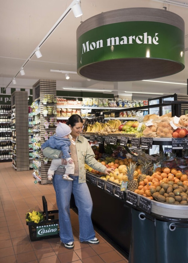 © Casinoune nouvelle identité, inspirée de l'héritage Casino, avec la bayadère emblématique évocatrice des épiceries d'antan- un espace « Mon Marché », dédié aux produits frais, avec une large place accordée aux fruits et légumes