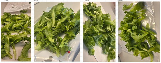 Après 28 jours de stockage réfrigéré en conditions de distribution, les feuilles conservent un aspect frais et vert, une texture croquante et ne présentent aucun signe visible d'altération, tel que le piquage. Les observations visuelles, documentées depuis la récolte jusqu'à la quatrième semaine, montrent une stabilité remarquable : absence de brunissement, de formation de mucus ou de dégradation de la texture. Les feuilles maintiennent leur fermeté structurelle et l'intensité de leur couleur tout au long de la période de conservation.