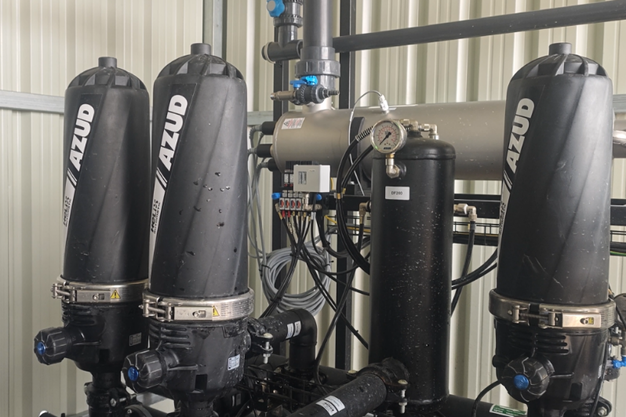 « La première étape consiste en une filtration mécanique à l'aide d'un équipement AZUD Helix Automatic assisté par air, avec deux niveaux de filtration de 100 et 5 microns, éliminant la plupart des particules organiques et inorganiques. »